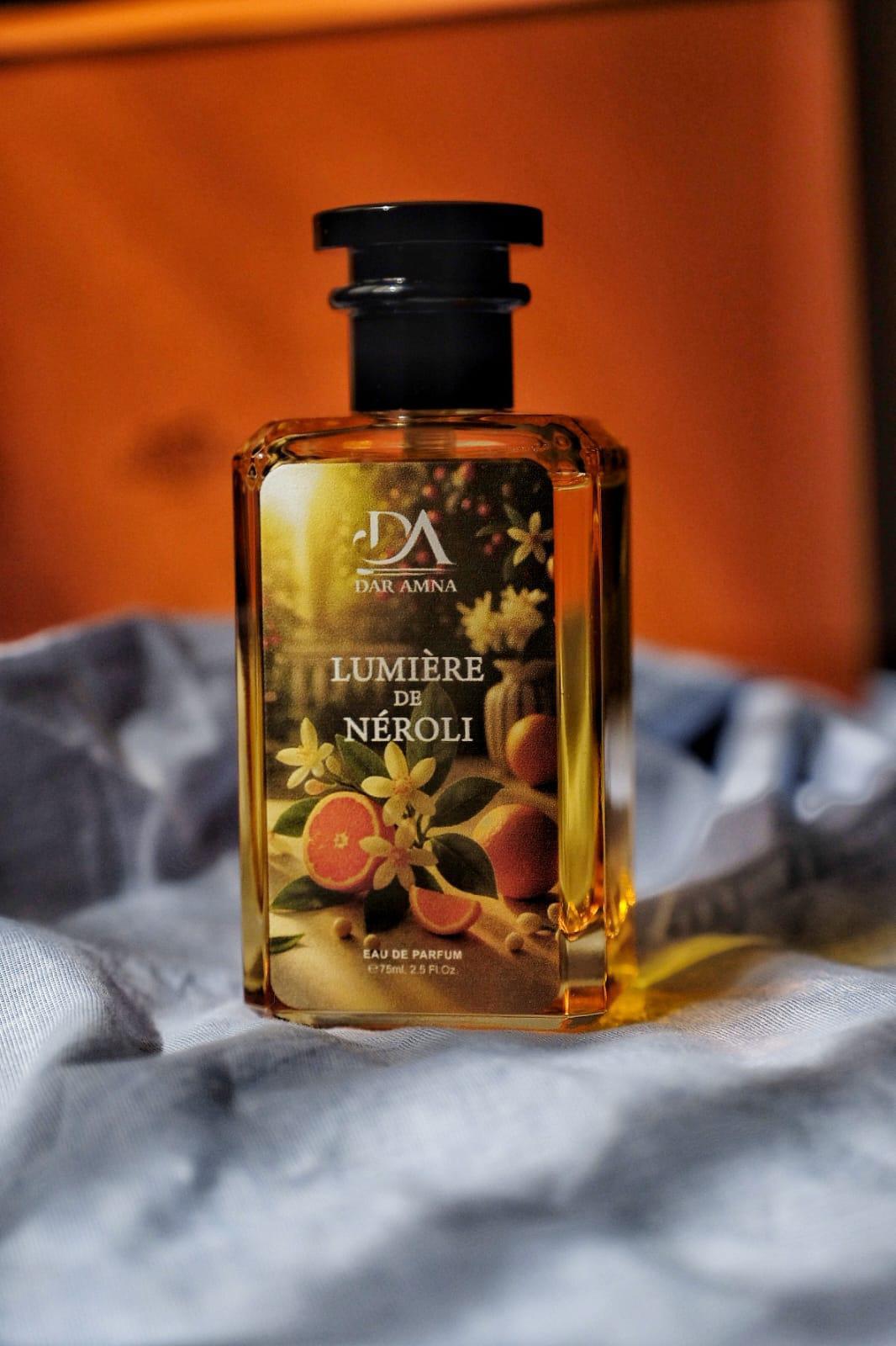 تخيل كوخًا صغيرًا وسط بساتين البرتقال، صباحٌ هادئ، والشمس تتخلل أغصان الشجر، والندى يلمع فوق الزهر كأنه لآلئ من نور. الهواء نقيّ… والنيرولي يتصاعد من الحقول كعطر الأرض حين تُبتلّ بالحياة. هنا يبدأ العطر. هنا يولد النور، بهدوء… وبثقة مكونات العطر ليمون ، زهور ، نيرولي .